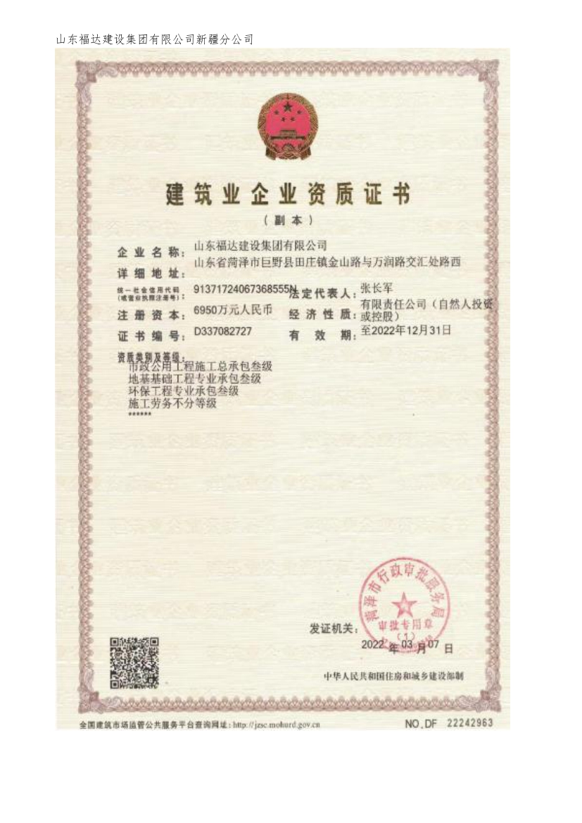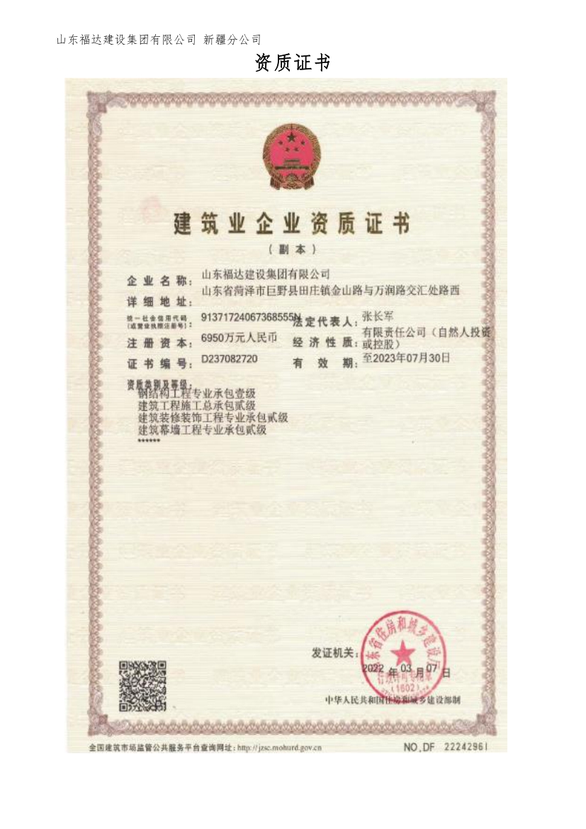 Shandong Fuda Construction Group Co., Ltd. Xinjiang Branch is located in Dafeng Industrial Park, Hutubi County, Changji City, with superior geographical location and convenient transportation. The company covers an area of 56000 square meters, with a production and construction area of 31000 square meters, an annual output value of 150 million yuan, and profits and taxes of 12 million yuan. With over 200 employees, it is a comprehensive modern enterprise that integrates the design, research and development, production, and installation of light steel, heavy steel, steel structure processing, prefabricated buildings, grid structures, curtain walls, and other engineering projects. Our company has complete qualifications, including Level 1 professional contracting for steel structure engineering, Level 2 general contracting for construction engineering, Level 2 professional contracting for building decoration and decoration engineering, Level 2 professional contracting for building curtain wall engineering, Level 3 general contracting for municipal public engineering construction, Level 3 professional contracting for foundation engineering, Level 3 professional contracting for environmental protection engineering, and no classification of construction labor. Achieve an annual production capacity of 60000 tons of prefabricated steel structure accessories. And has passed the IS09001 quality, safety, and environmental three system certification. The company emphasizes the system of quality first and safety accompanying, regularly organizes employee skill training, passes safety positions, improves employee technical skills, and enhances employee safety awareness. The company has an independent production workshop and is equipped with advanced production equipment. In the steel structure processing workshop, the system is standardized, the equipment is complete, and regular safety inspections are carried out. All equipment is inspected monthly to ensure product quality in the workshop processing work. As a key project for attracting investment, it has received high attention from the leaders of the city and county governments. In recent years, while consolidating the market within the province, the company has expanded the market outside the province. While growing bigger and stronger, the company insists on creating a brand with quality, expanding the market with reputation, and seeking development with technology. It maintains good cooperation with many excellent companies