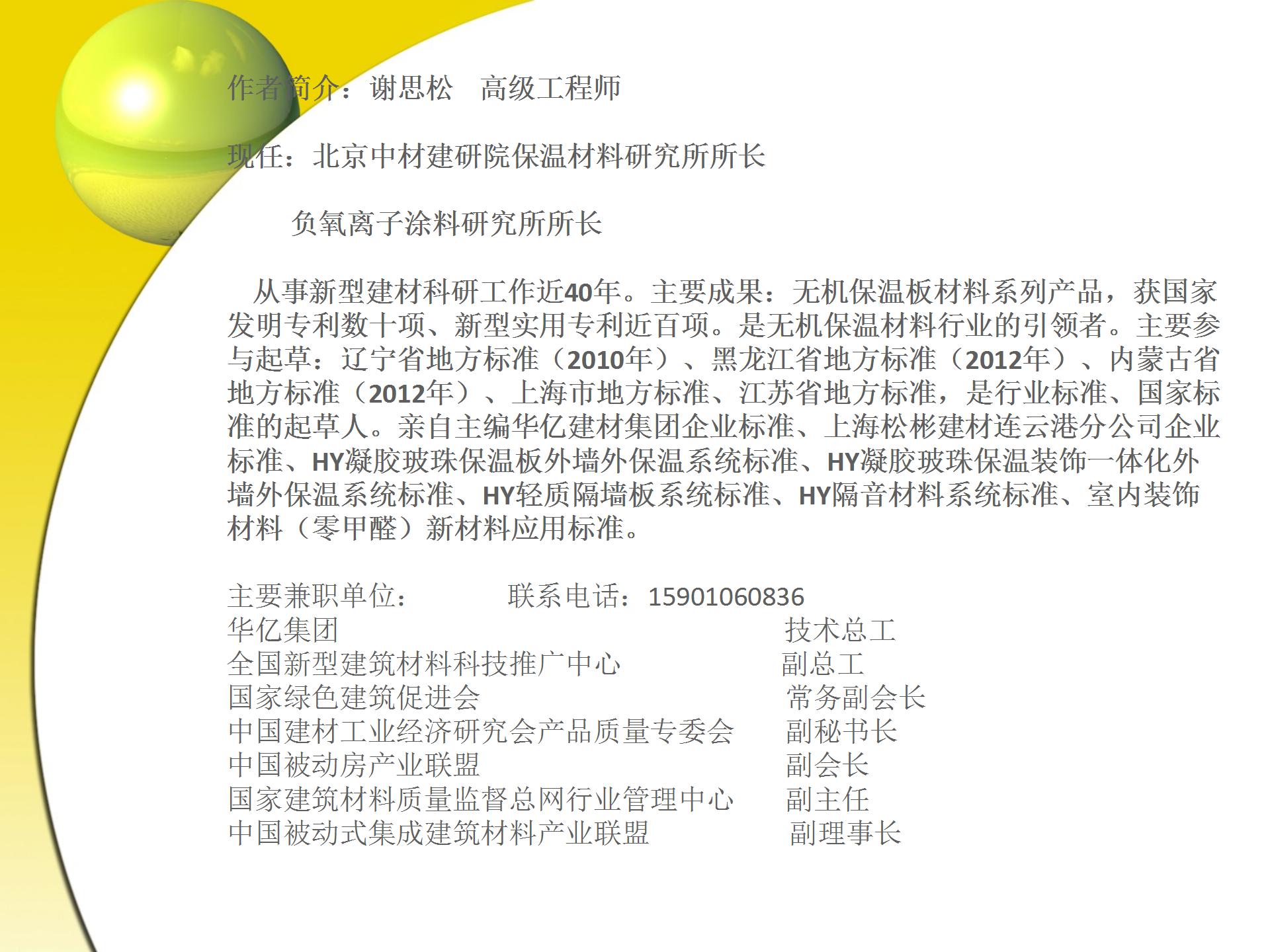 Personally edited the enterprise standard of Huayi Building Materials Group, the enterprise standard of Shanghai Songbin Building Materials Lianyungang Branch, HY gel glass bead insulation decoration integrated exterior wall insulation system standard, HY light partition board system standard, HY sound insulation material system standard, interior decoration material (zero formaldehyde) new material application standard.
