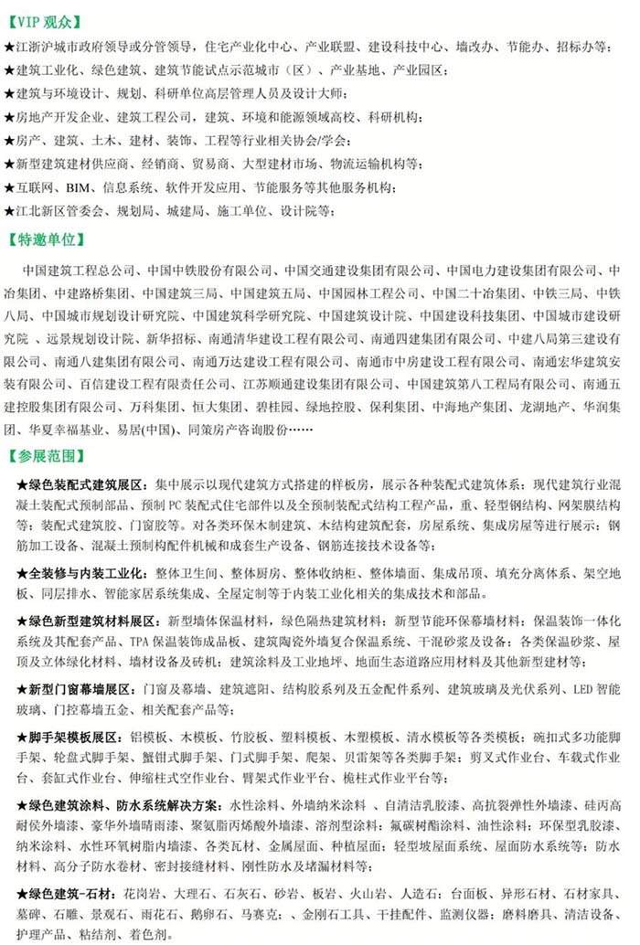 中國(南通)國際綠色建筑建材產(chǎn)業(yè)博覽會(huì)(簡(jiǎn)稱:GACME南通綠色建博會(huì)) 據(jù)悉,目前展會(huì)招展工作已進(jìn)入收官階段;德州海天、廣聯(lián)達(dá)科技股份、江蘇吉潤、浙江億洲、凡林建科、廈門市鑫宏華、比姆泰客、陜西普石、山東三英、河北華鯤、興化市華成、揚(yáng)州新晶、南通樂佳、萬鴻雙喜集團(tuán)、任丘市金獅焊接、廣州景興、常熟風(fēng)范、多維綠建、亞聯(lián)河北、任丘市鑫晨、江蘇利信、山東金力、任丘市博盛等多家業(yè)內(nèi)知名企業(yè)將紛紛亮相,以展示企業(yè)最新產(chǎn)品、招商政策等。
